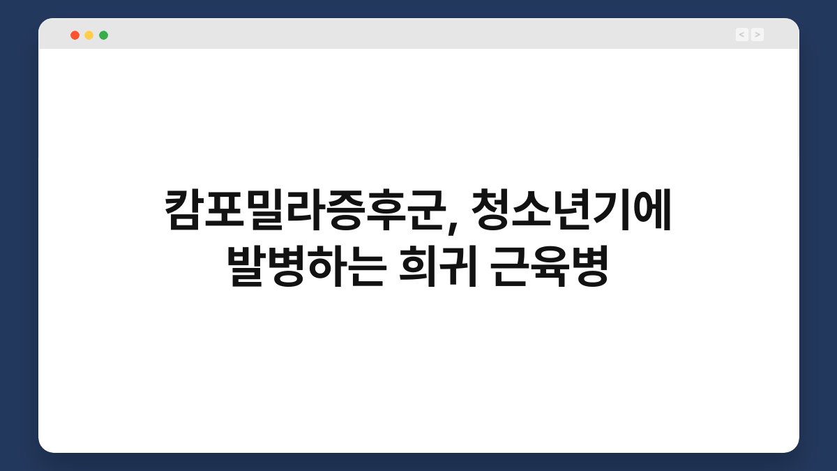 캄포밀라증후군은 청소년기에 발병하는 희귀 근육병으로, 근육의 기능을 저하시켜 일상생활에 큰 영향을 미칩니다. 이 병은 유전적 요인과 환경적 요인이 복합적으로 작용하여 발생합니다. 특히, 근육의 약화와 피로감은 환자에게 심각한 불편을 초래합니다.
