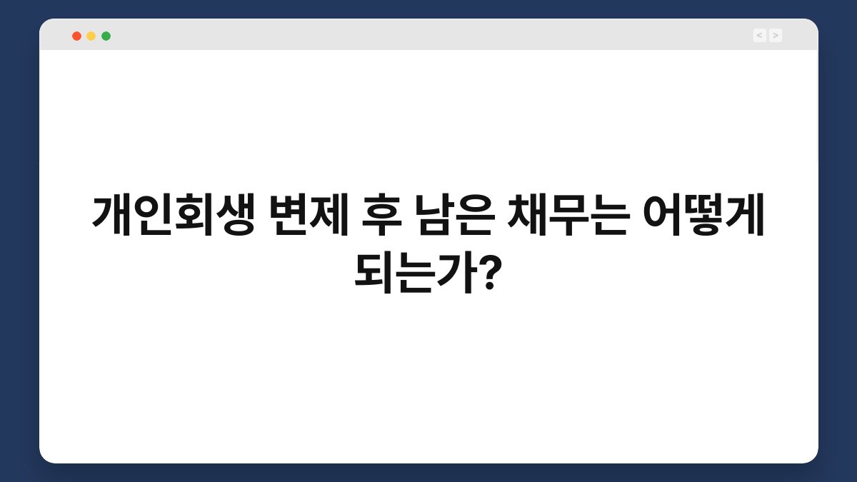 채무 문제로 고민하는 분들이 많습니다. 특히 개인회생을 통해 변제를 마친 후 남은 채무에 대한 궁금증이 클 텐데요. 많은 분들이 이 시점에서 막막함을 느끼곤 합니다. 변제 후 남은 채무는 어떻게 되는지, 그리고 어떤 조치를 취해야 하는지에 대해 알아보겠습니다. 이 글을 통해 여러분의 궁금증을 해소하고, 더 나은 재정 관리를 위한 방향을 제시해 드리겠습니다.