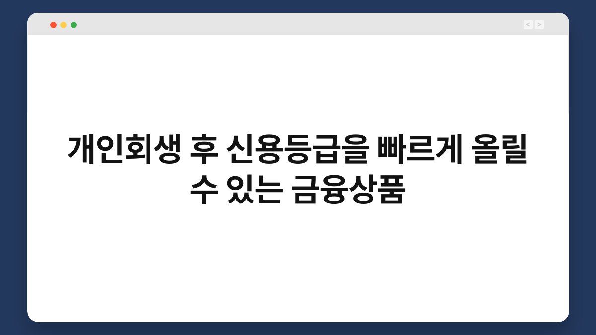 신용등급, 회복하기 어렵다고 생각하시죠? 하지만 개인회생 후에도 신용등급을 빠르게 올릴 수 있는 금융상품이 있습니다. 이 글에서는 개인회생을 경험한 분들이 어떻게 신용을 회복할 수 있는지에 대한 유용한 정보를 제공할 것입니다. 신용등급을 높이기 위한 다양한 금융상품과 그 활용 방법을 알아보며, 실질적인 조언을 드리겠습니다. 끝까지 읽어보시면 신용회복의 길이 훨씬 더 밝아질 거예요.