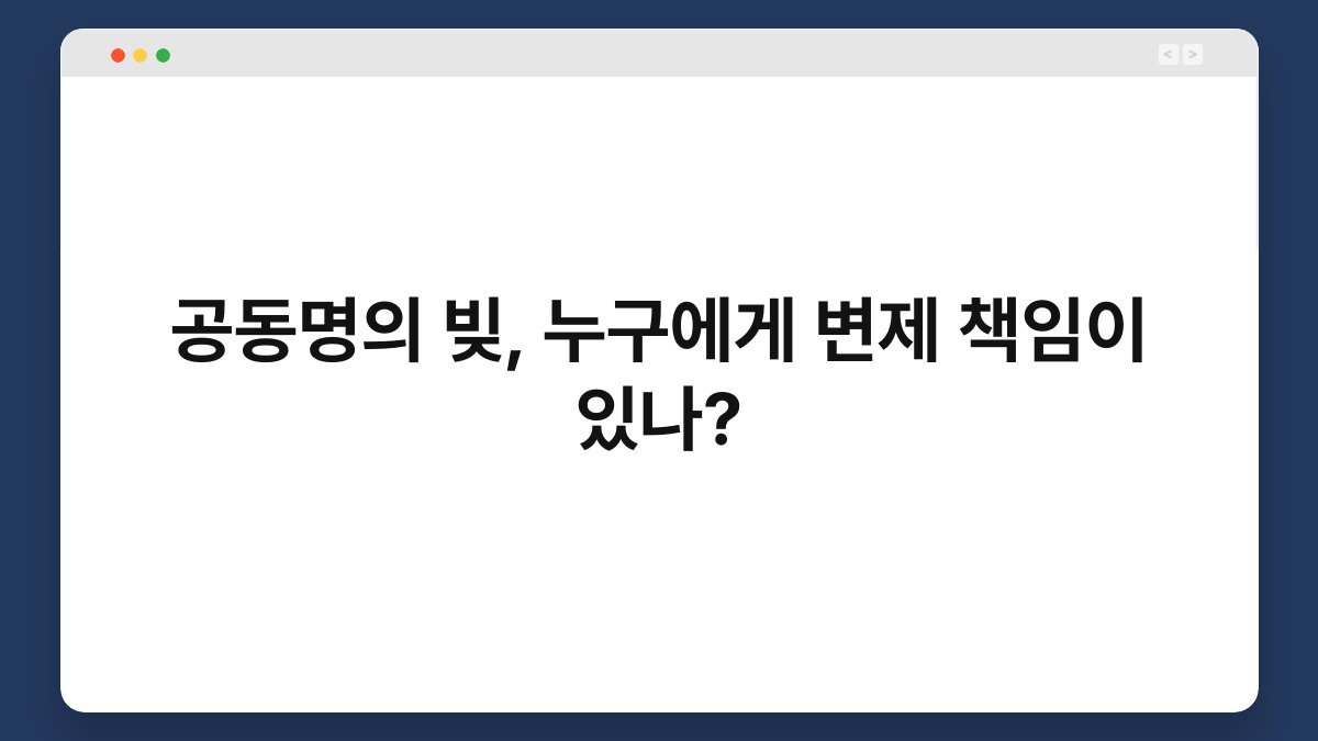 부부가 함께 집을 구매하거나 사업을 진행하면서 공동명의로 빚을 지는 경우가 많습니다. 이럴 때, 빚에 대한 변제 책임은 누구에게 있는지 고민하게 되죠. 공동명의로 빚을 지면, 각자의 책임이 어떻게 나누어지는지 명확히 이해하는 것이 중요합니다. 이 글에서는 공동명의 빚에 대한 변제 책임을 자세히 살펴보겠습니다. 이를 통해 여러분의 궁금증을 해소하고, 향후 발생할 수 있는 문제를 예방할 수 있도록 도와드리겠습니다.