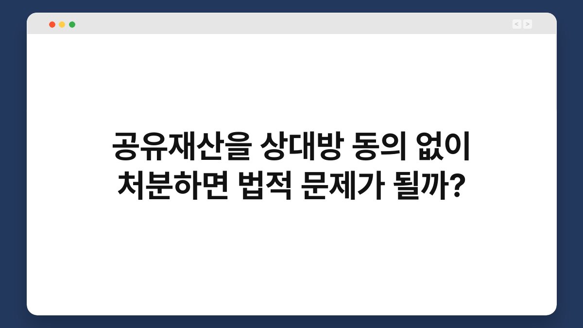 공유재산을 상대방 동의 없이 처분하는 것은 법적 문제를 야기할 수 있습니다. 이와 관련된 여러 가지 상황을 살펴보면, 법적 분쟁이 발생할 가능성이 높아집니다. 특히, 공유재산의 경우 상대방의 권리와 이익이 얽혀 있기 때문에 더욱 신중해야 합니다. 이 글에서는 공유재산을 처분할 때 주의해야 할 법적 사항과 그로 인해 발생할 수 있는 문제를 자세히 설명하겠습니다. 끝까지 읽으신다면, 법적 문제를 피하는 데 큰 도움이 될 것입니다.
