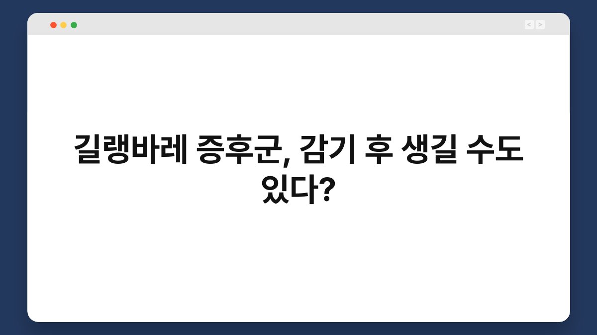감기 증상이 사라진 후에도 몸이 이상하다고 느껴본 적이 있으신가요? 많은 분들이 감기를 앓고 난 뒤에 이상한 증상이나 피로감을 경험하는 경우가 있습니다. 그런데 이러한 증상 중 하나가 바로 길랭바레 증후군이라는 희귀한 질환일 수 있다는 사실, 알고 계셨나요? 이번 글에서는 길랭바레 증후군이 감기 후에 발생할 수 있는 이유와 그 증상, 예방 방법에 대해 알아보겠습니다. 이 글을 통해 건강에 대한 유용한 정보를 얻어가시길 바랍니다.