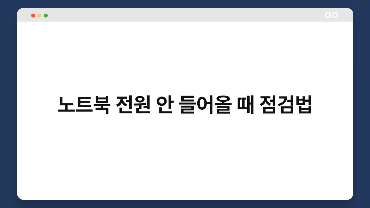 노트북 전원이 켜지지 않는 상황, 정말 당황스럽죠? 중요한 업무나 개인적인 프로젝트가 있을 때, 전원이 안 들어오면 불안감이 커집니다. 하지만 걱정하지 마세요. 이 글에서는 노트북 전원 안 들어올 때 점검법을 소개해 드리겠습니다. 간단한 점검으로 문제를 해결할 수 있는 방법을 함께 알아보아요. 이제 차근차근 따라해 보세요!