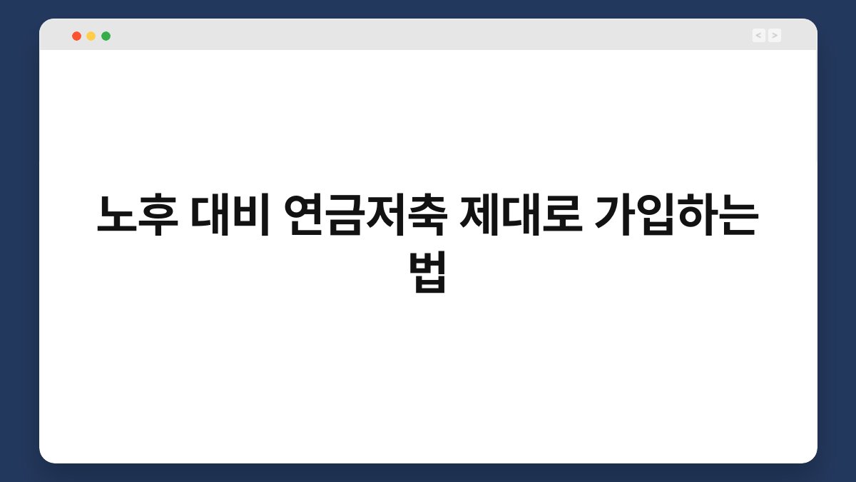 노후 대비는 누구에게나 중요한 문제입니다. 특히 연금저축은 안정적인 노후를 위한 필수 요소로 자리 잡고 있죠. 그런데 막상 가입하려고 하면 여러 가지 정보가 혼란스러워지기 마련입니다. 이 글에서는 노후 대비 연금저축을 제대로 가입하는 방법을 쉽게 설명해드릴게요. 연금저축의 필요성과 가입 방법을 함께 살펴보며, 여러분의 노후를 한층 더 안전하게 만들어보세요.