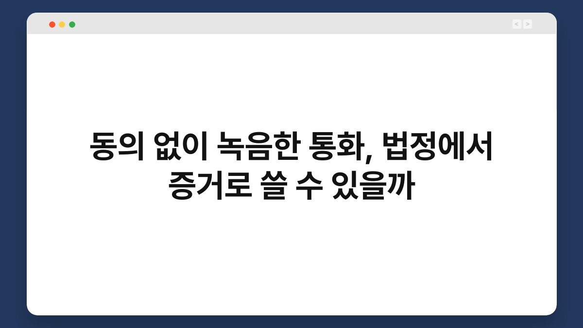 상대방의 동의 없이 녹음한 통화, 법정에서 증거로 사용할 수 있을까요? 많은 사람들이 이런 상황에 대해 궁금해합니다. 특히 법적 분쟁이 발생했을 때, 녹음된 통화가 중요한 증거가 될 수 있습니다. 하지만 법률적으로는 어떻게 될까요? 이 글에서는 동의 없이 녹음한 통화의 법적 효력을 살펴보고, 어떤 경우에 증거로 인정되는지 알아보겠습니다. 궁금증을 해결하고, 법적 분쟁에 대비하는 데 도움이 되길 바랍니다.