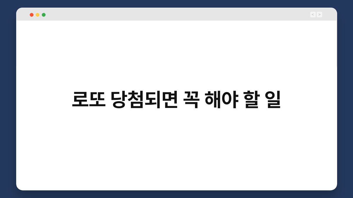 로또에 당첨되는 것은 많은 사람들의 꿈입니다. 하지만 당첨된 후에는 무엇을 해야 할지 막막해지는 경우가 많습니다. 이 글에서는 로또 당첨되면 꼭 해야 할 일들을 정리해 보겠습니다. 당첨금을 어떻게 관리하고, 세금 문제는 어떻게 해결하는지에 대한 유용한 정보도 포함되어 있습니다. 함께 이 흥미로운 여정을 떠나보도록 하죠.