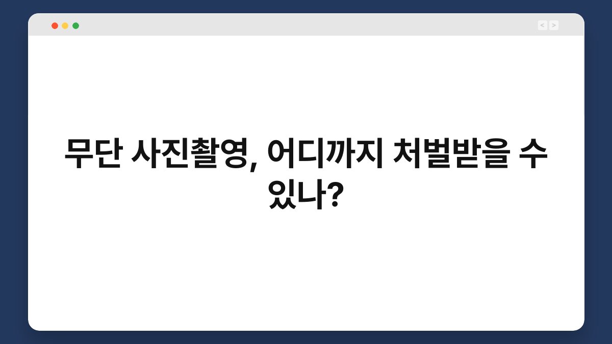 무단 사진촬영, 이 문제는 요즘 더욱 심각해지고 있습니다. 공공장소에서의 사생활 침해와 개인의 권리에 대한 논란이 끊이지 않죠. 그렇다면 무단 사진촬영은 어디까지 처벌받을 수 있을까요? 이 글에서는 관련 법률과 사례를 통해 이 문제를 자세히 살펴보겠습니다. 여러분의 소중한 권리를 지키기 위해 꼭 알아두어야 할 내용이니 끝까지 함께해 주세요.