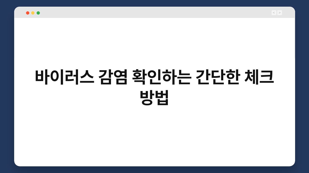 요즘 바이러스 감염에 대한 걱정이 커지고 있죠? 감염 여부를 확인하는 간단한 체크 방법을 알고 있다면, 불안감을 덜 수 있습니다. 이 글에서는 바이러스 감염을 확인하는 쉽고 효과적인 방법들을 소개할 예정입니다. 필요한 정보들을 쏙쏙 정리해 드릴 테니, 끝까지 함께 해주세요. 건강한 삶을 위한 첫걸음을 내딛는 기회가 될 것입니다.