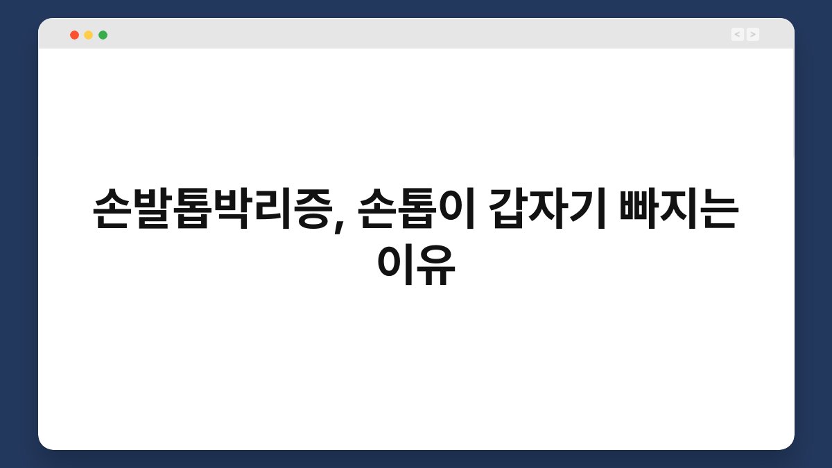 갑자기 손톱이 빠지는 경험, 누구나 겪어본 적이 있을지도 모릅니다. 하지만 그 이유가 손발톱박리증이라는 질환 때문일 수 있다는 사실, 알고 계셨나요? 손톱이 빠지는 이유는 여러 가지가 있지만, 손발톱박리증은 그중에서도 주목해야 할 원인 중 하나입니다. 이 글에서는 손발톱박리증의 증상과 원인, 그리고 예방 및 치료 방법에 대해 알아보겠습니다. 이제 함께 이 흥미로운 주제를 살펴보도록 하죠.