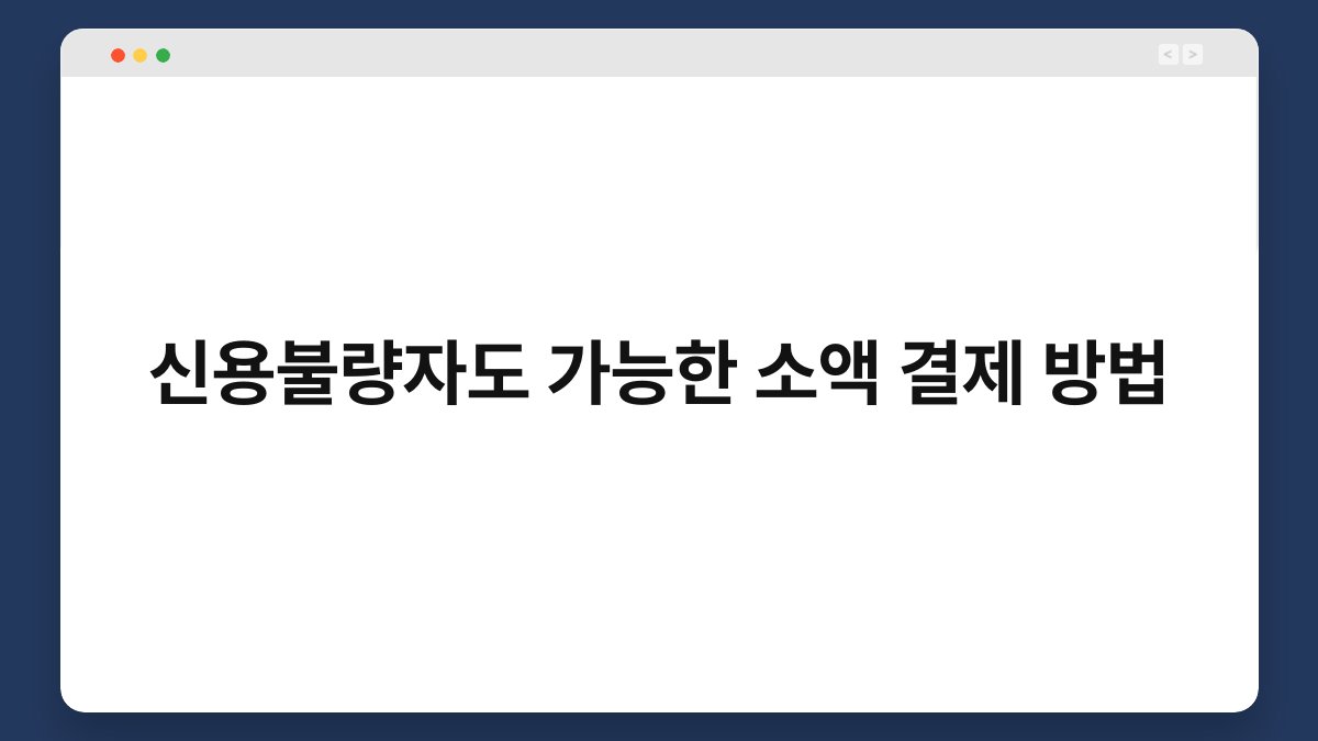 신용불량자도 가능한 소액 결제 방법은 다양합니다. 선불카드, 모바일 결제 앱, 무신용 거래 플랫폼 등을 통해 필요한 물품을 구매할 수 있습니다. 이러한 방법을 활용하면서 신용 회복의 기회를 만들어 보세요.