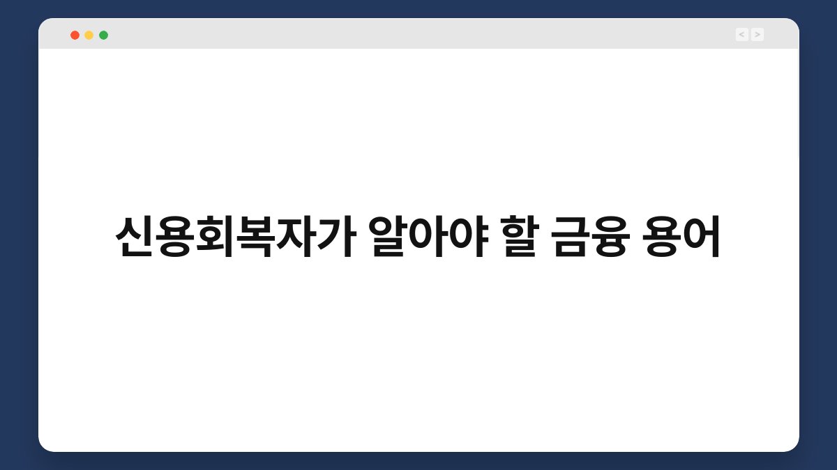 신용회복자에게 필요한 금융 용어를 이해하는 것은 매우 중요합니다. 금융 용어는 복잡하게 느껴질 수 있지만, 이 글을 통해 쉽게 접근할 수 있도록 도와드리겠습니다. 신용회복 과정에서 마주치는 다양한 용어를 알면 더 나은 금융 결정을 내릴 수 있습니다. 이 글에서는 신용회복자가 알아야 할 금융 용어를 친절하게 설명하겠습니다. 끝까지 읽고 유용한 정보를 얻어가세요.