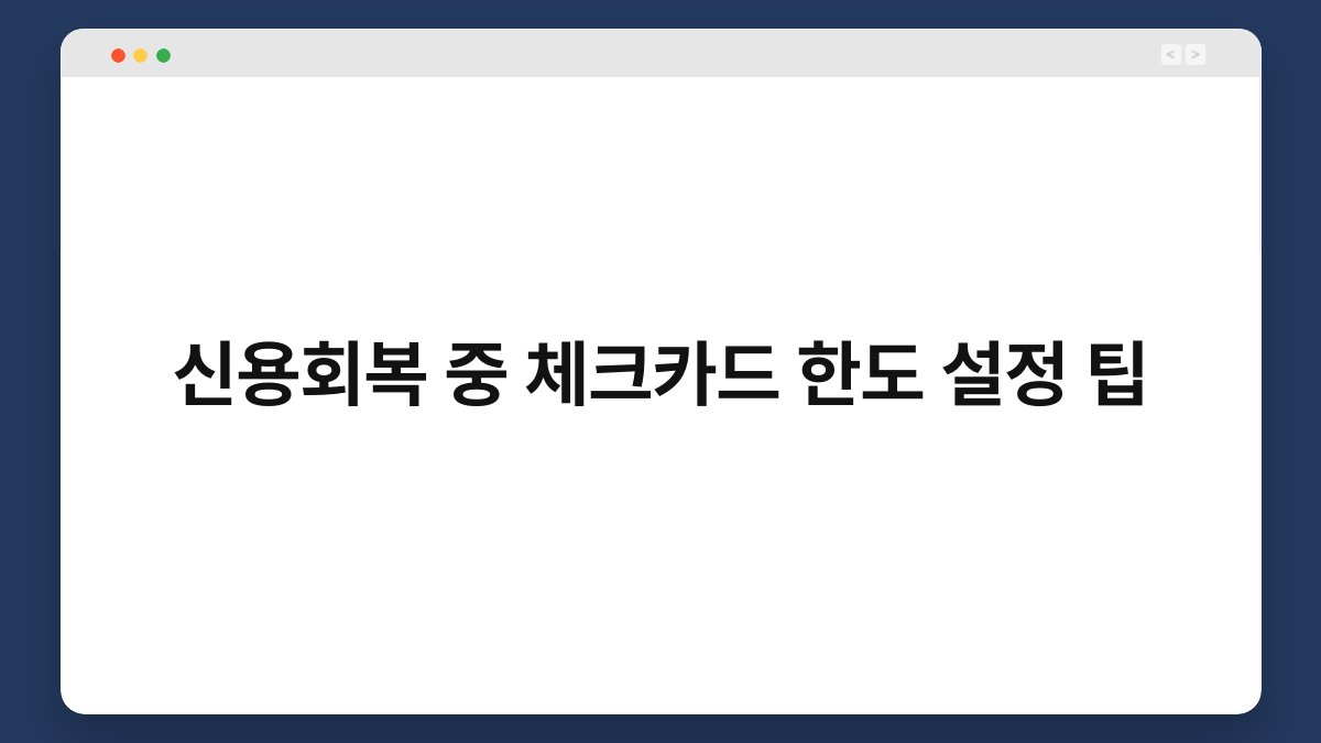 신용회복 중 체크카드 한도 설정은 많은 분들이 놓치는 중요한 부분입니다. 신용회복 과정에서 경제적 안정성을 찾는 것은 필수적인데요, 이때 체크카드 한도를 적절히 설정하는 것이 큰 도움이 될 수 있습니다. 한도를 잘 설정하면 불필요한 지출을 줄이고, 재정 관리를 효율적으로 할 수 있습니다. 오늘은 신용회복 중 체크카드 한도 설정에 대한 유용한 팁을 소개해 드리겠습니다. 끝까지 읽으시면 실질적인 도움이 될 거예요.