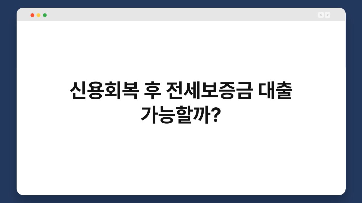 신용회복 후 전세보증금 대출이 가능할지에 대한 고민, 많은 분들이 한 번쯤은 해보셨을 겁니다. 신용이 회복된 후에도 대출이 가능할지에 대한 궁금증은 특히 전세를 계획하는 분들에게 매우 중요한 문제입니다. 이 글에서는 신용회복 후 전세보증금 대출의 가능성과 주의사항을 자세히 살펴보겠습니다. 신용 회복 이후의 대출 조건과 절차를 이해하면 더욱 현명한 선택을 할 수 있습니다. 함께 알아보시죠!