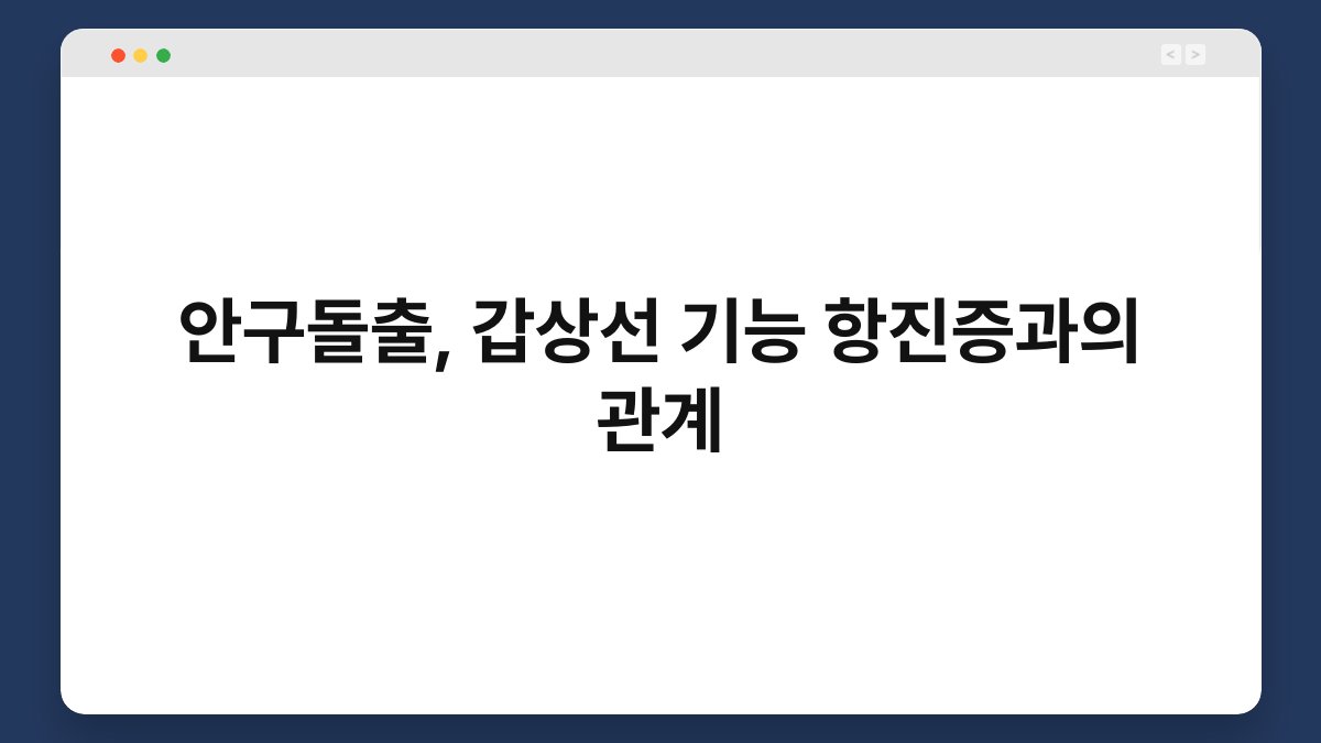 갑상선 기능 항진증, 들어보신 적 있으신가요? 이 질환은 우리 몸의 대사에 큰 영향을 미치며, 여러 증상을 동반할 수 있습니다. 특히, 안구 돌출은 갑상선 기능 항진증과 밀접한 관계가 있다는 사실을 아시나요? 많은 분들이 이 두 가지의 연관성을 간과하시곤 합니다. 오늘은 안구 돌출과 갑상선 기능 항진증의 관계에 대해 알아보도록 하겠습니다. 함께 살펴보면 좋겠죠?