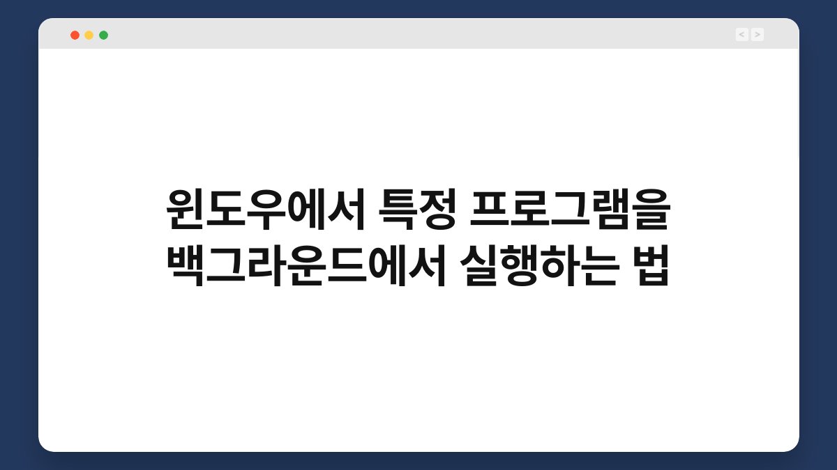 윈도우에서 특정 프로그램을 백그라운드에서 실행하는 방법, 궁금하시죠? 많은 분들이 작업 중 여러 프로그램을 동시에 실행해야 할 때 불편함을 느끼곤 합니다. 특히, 특정 프로그램이 화면을 차지하고 있어 다른 작업에 방해가 될 때가 많습니다. 하지만 걱정하지 마세요. 이번 글에서는 윈도우에서 특정 프로그램을 백그라운드에서 실행하는 간단한 방법을 소개하겠습니다. 이 방법을 통해 효율적으로 작업을 진행할 수 있습니다.