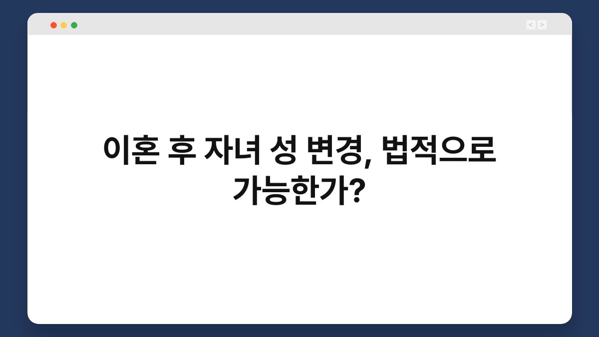 이혼 후 자녀의 성 변경에 대한 고민, 많은 부모님들이 한 번쯤은 생각해보셨을 것입니다. 이 과정이 법적으로 가능한지에 대한 궁금증도 클 텐데요. 법의 복잡함 속에서 자녀의 성을 변경하고자 할 때, 어떤 절차가 필요한지 알아보는 것이 중요합니다. 이 글에서는 이혼 후 자녀 성 변경이 법적으로 가능한지, 그리고 그 과정에 대해 자세히 설명드리겠습니다. 끝까지 함께 해주세요.