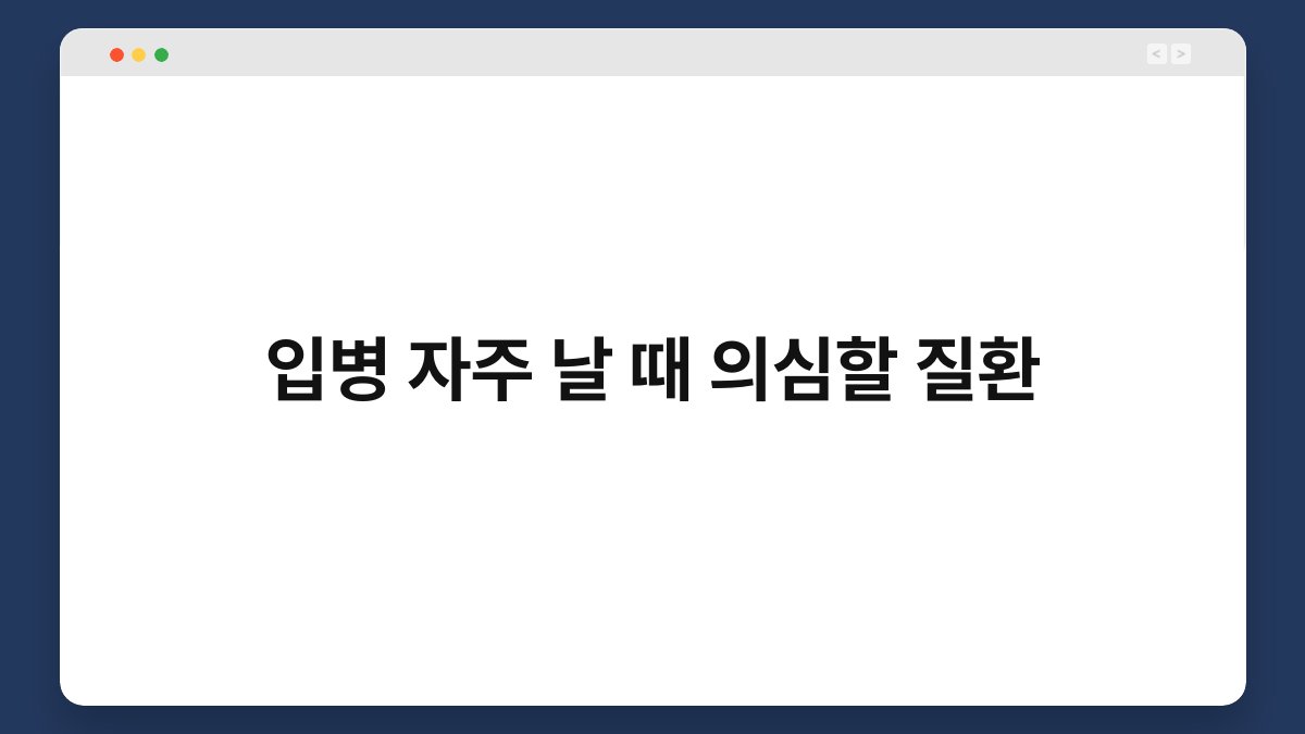 입병이 자주 나면 불편함이 크죠? 이럴 때는 단순히 구강 위생 문제로 치부하기에는 위험할 수 있습니다. 입병은 자주 발생할 경우 여러 질환의 신호일 수 있기 때문입니다. 이번 글에서는 입병이 자주 날 때 의심할 수 있는 질환들에 대해 알아보겠습니다. 이러한 정보가 여러분의 건강 관리에 도움이 되기를 바랍니다.