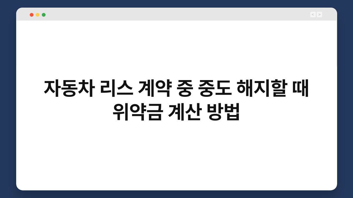 자동차 리스 계약을 맺고 나면, 예상치 못한 상황이 생길 수 있습니다. 이럴 때 중도 해지를 고려하신다면, 위약금 계산 방법이 궁금할 것입니다. 중도 해지는 간단해 보이지만, 실제로는 여러 요소를 고려해야 합니다. 본 글에서는 자동차 리스 계약 중 중도 해지 시 위약금 계산 방법을 상세히 설명드리겠습니다. 이 정보를 통해 보다 현명한 결정을 내리실 수 있을 것입니다.