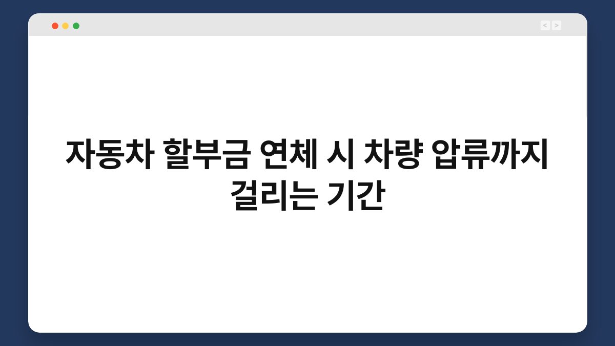 자동차를 구매할 때 많은 분들이 할부를 선택합니다. 하지만 할부금을 연체하게 되면 어떤 일이 벌어질까요? 특히, 연체가 길어지면 차량 압류까지 이어질 수 있다는 사실은 많은 분들이 간과하고 있습니다. 이 글에서는 자동차 할부금 연체 시 차량 압류까지 걸리는 기간과 그 과정에 대해 자세히 알아보겠습니다. 연체를 피하기 위한 유용한 정보도 함께 제공하니 끝까지 읽어보세요.