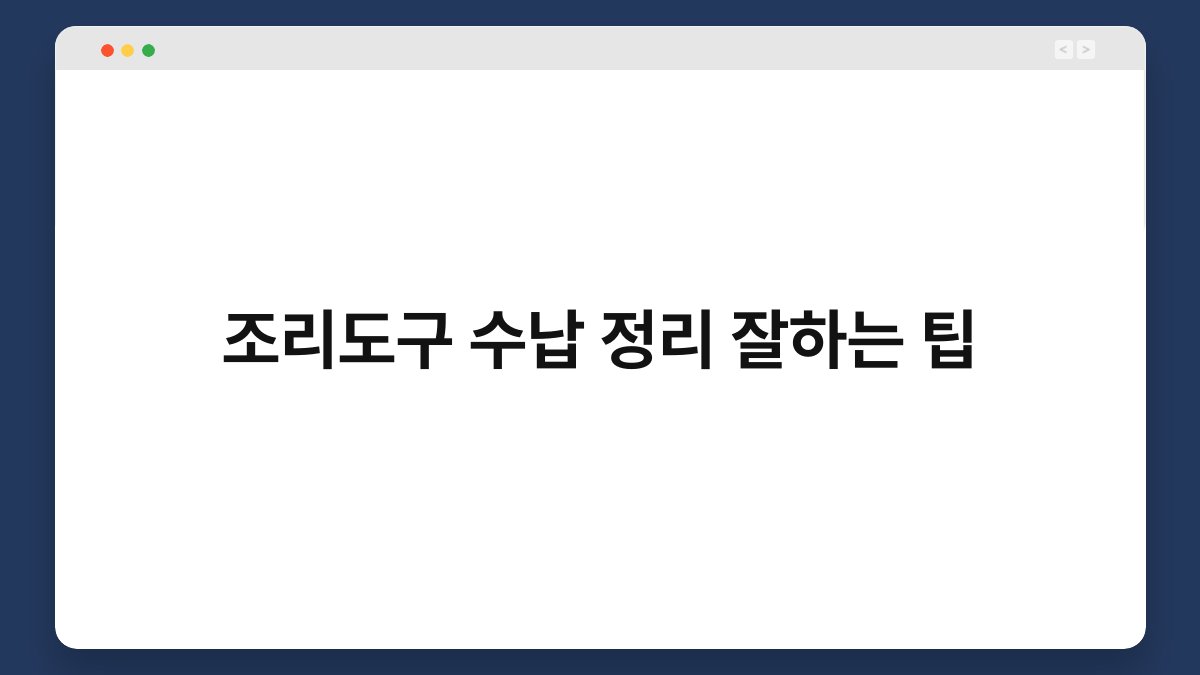 조리도구를 정리할 때, 자주 사용하는 도구는 눈에 잘 띄는 곳에 배치하는 것이 중요합니다. 예를 들어, 조리대에 도마와 칼을 항상 두고, 양념통은 쉽게 꺼낼 수 있는 곳에 배치하세요. 이렇게 하면 요리할 때마다 시간을 절약할 수 있습니다.