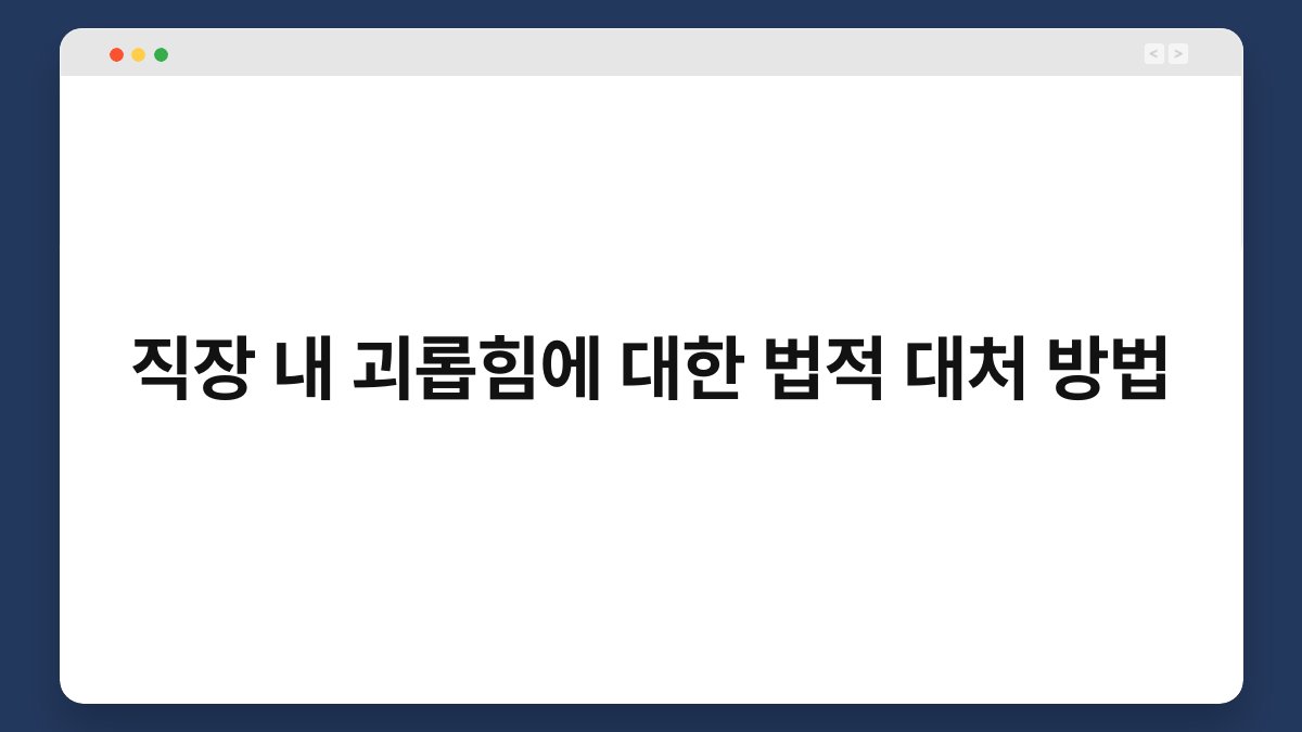 직장 내 괴롭힘, 여러분은 이 문제를 가볍게 여기지 않으셨으면 좋겠습니다. 많은 사람들이 직장에서의 스트레스를 당연하게 여기지만, 괴롭힘은 결코 묵과할 수 없는 심각한 사안입니다. 이 글에서는 직장 내 괴롭힘에 대한 법적 대처 방법을 살펴보겠습니다. 법적 대응은 복잡하게 느껴질 수 있지만, 그 과정을 이해하면 도움이 될 것입니다. 여러분의 권리를 지키기 위해 필요한 정보들을 함께 살펴보겠습니다.