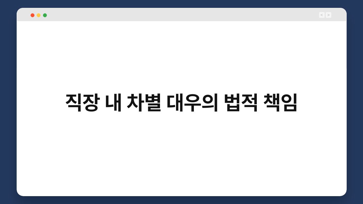 직장에서 차별을 당했을 때, 법적 책임이란 차별 행위로 인해 발생하는 법적 의무를 의미합니다. 이는 피해자가 차별 대우를 입증할 경우, 가해자나 기업이 법적 처벌을 받을 수 있다는 것을 포함합니다. 따라서 차별 대우를 당한 경우, 법적 절차를 통해 권리를 주장할 수 있습니다.