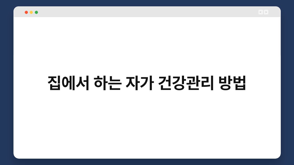 집에서 건강관리를 하는 방법, 생각만 해도 흥미롭지 않나요? 요즘 많은 분들이 바쁜 일상 속에서 건강을 챙기기 어려워하고 있습니다. 하지만 집에서도 손쉽게 자가 건강관리를 할 수 있는 방법들이 많습니다. 이 글에서는 집에서 실천할 수 있는 다양한 건강관리 방법을 소개하며, 여러분의 건강한 삶을 위한 작은 팁을 제공하고자 합니다. 끝까지 읽으시면, 건강을 지키는 데 도움이 되는 유용한 정보가 가득할 것입니다.