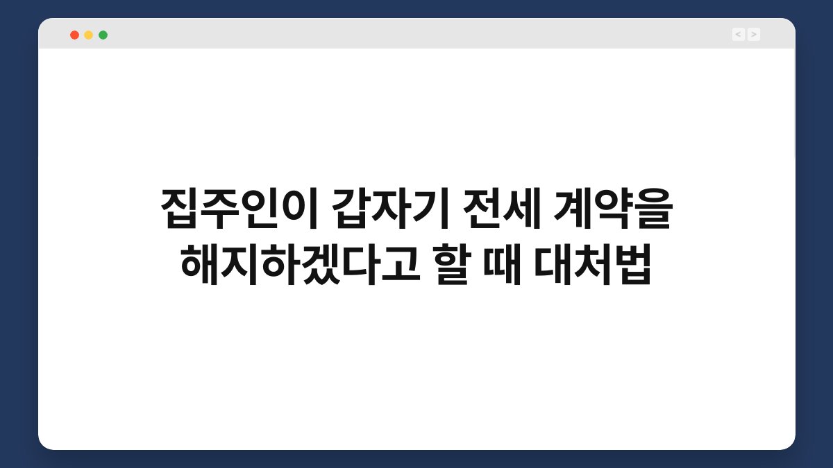 갑자기 집주인이 전세 계약을 해지하겠다고 통보하면 정말 당황스럽죠? 이런 상황에 직면했을 때 어떻게 대처해야 할지 막막할 수 있습니다. 하지만 걱정하지 마세요. 이 글에서는 집주인이 전세 계약을 해지할 때의 대처법과 필요한 정보들을 안내해 드릴게요. 여러분이 이 글을 통해 상황을 잘 헤쳐 나갈 수 있도록 도와드리겠습니다.