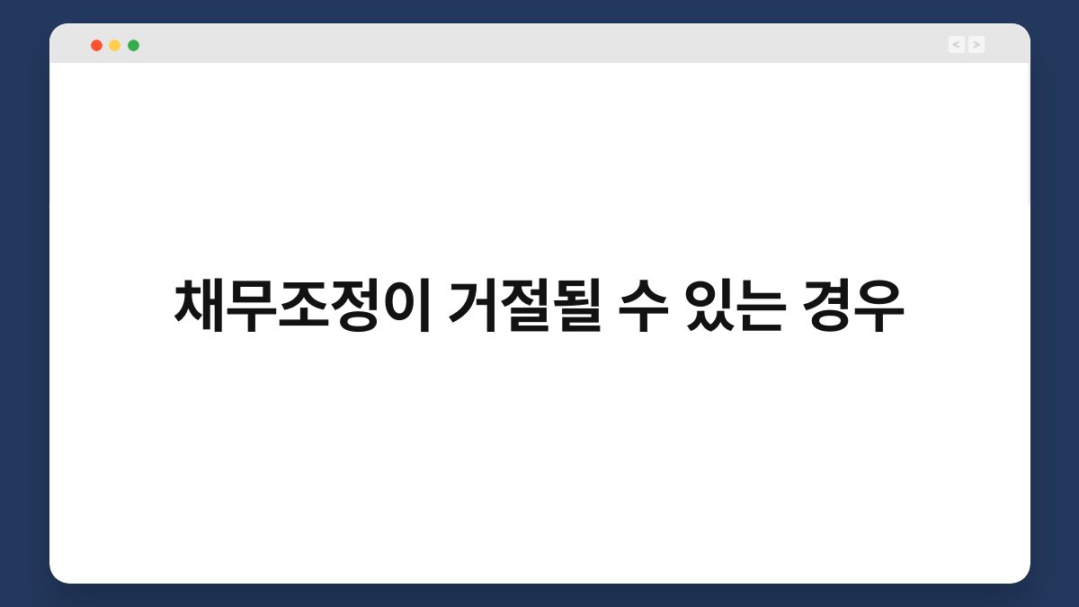 채무조정은 법원이나 금융기관의 판단에 따라 거절될 수 있습니다. 각 기관은 신청자의 상황을 종합적으로 고려하여 결정을 내립니다. 이때, 신청자의 재정 상황이나 채무 상환 능력이 중요한 요소로 작용합니다. 따라서 신청 전 충분한 준비가 필요합니다.