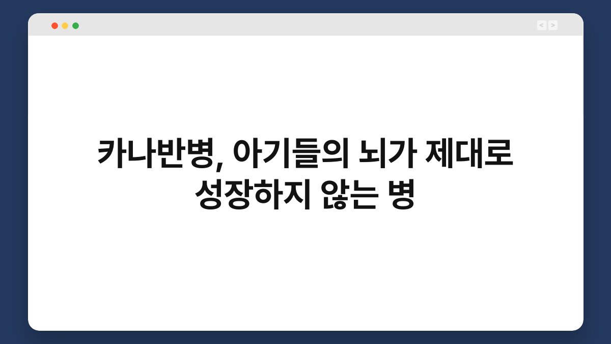 아기들이 태어나면서 가장 중요한 것은 바로 뇌의 건강한 성장입니다. 하지만 카나반병이라는 질병이 아기들의 뇌 발달에 영향을 미칠 수 있다는 사실, 알고 계신가요? 이 병은 아기들의 뇌가 제대로 성장하지 않게 만들어, 여러 가지 문제를 일으킬 수 있습니다. 오늘은 카나반병의 원인과 증상, 그리고 예방 방법에 대해 알아보겠습니다. 이 글을 통해 아기들의 뇌 건강을 지키는 데 도움이 되길 바랍니다.