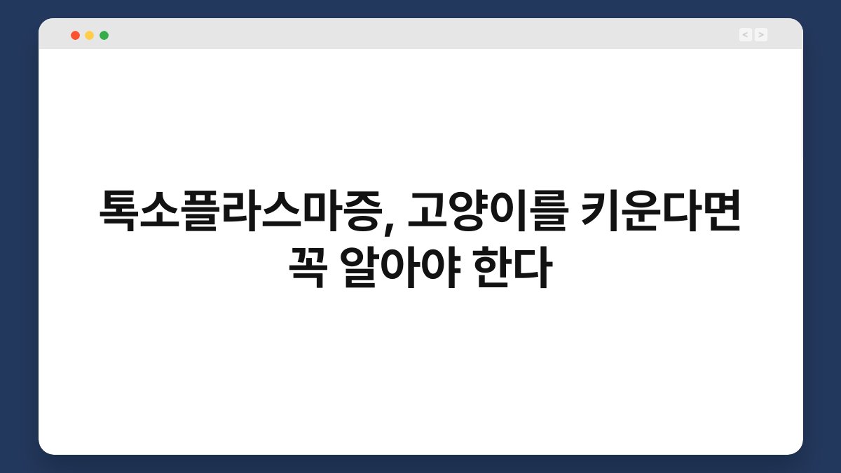 고양이를 키우는 분들, 혹은 고양이에 관심이 있는 분들께서는 톡소플라스마증이라는 질병에 대해 들어보셨을 것입니다. 이 질병은 고양이와 밀접한 관계가 있으며, 우리에게도 영향을 미칠 수 있습니다. 특히 고양이를 사랑하는 만큼, 그들의 건강과 우리의 안전을 함께 고려해야 합니다. 이 글에서는 톡소플라스마증의 원인, 증상, 예방법 등을 자세히 살펴보겠습니다. 끝까지 읽어보시면 고양이와의 안전한 동거를 위한 유용한 정보를 얻으실 수 있습니다.