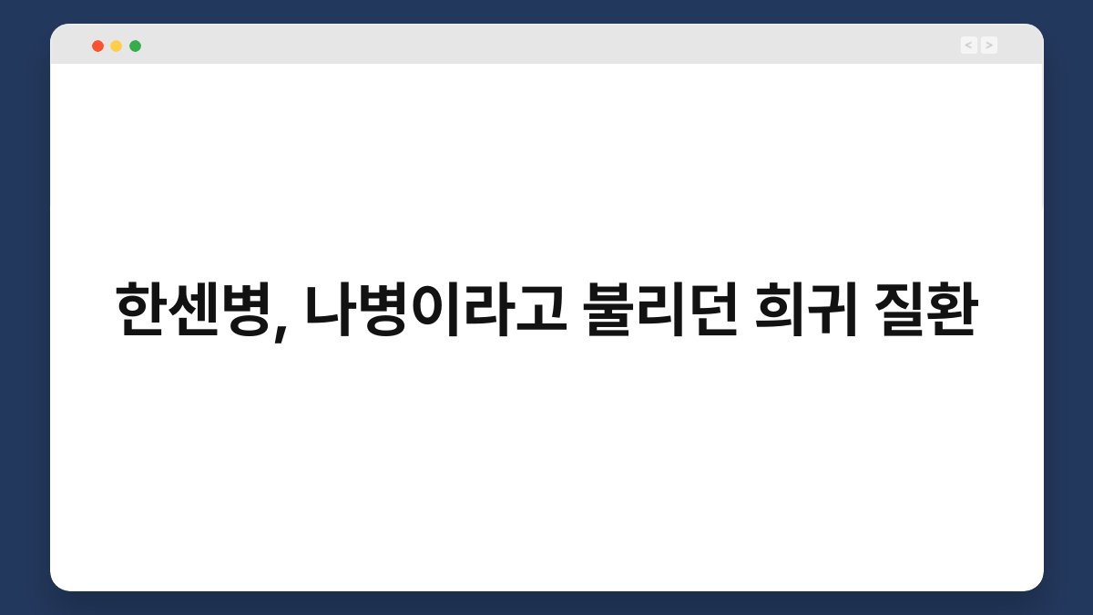 한센병은 19세기 중반, 노르웨이의 의사 한센이 이 질환의 원인균을 발견하면서 이름 붙여졌습니다. 이 질환은 주로 피부와 신경에 영향을 미치며, 전염성이 있는 것으로 알려져 있습니다. 하지만 현대 의학의 발전으로 이 질환에 대한 오해가 많이 해소되었습니다.