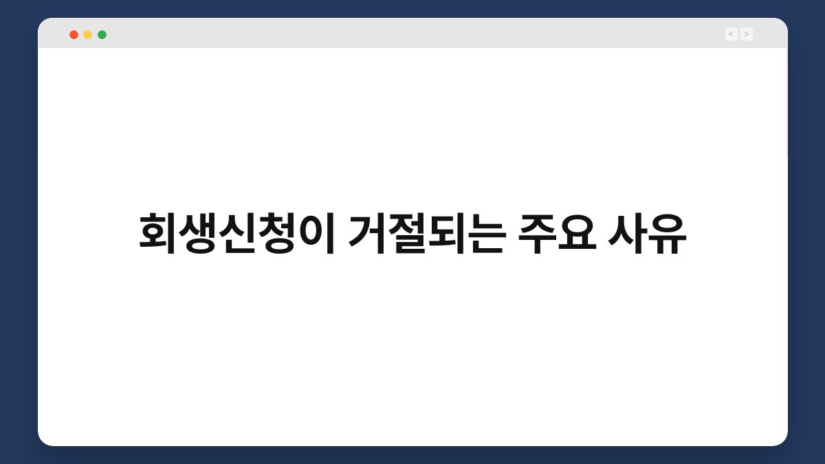 어떤 이유로 회생신청이 거절될 수 있는지 궁금하신가요? 많은 분들이 회생신청을 통해 새로운 시작을 꿈꾸지만, 생각보다 많은 사유로 인해 신청이 거절될 수 있습니다. 이 글에서는 회생신청이 거절되는 주요 사유를 살펴보며, 이를 통해 미리 준비할 수 있는 방법을 알려드리겠습니다. 회생신청을 고려하고 계신 분들에게 유용한 정보가 될 것입니다. 끝까지 함께 해 주세요.