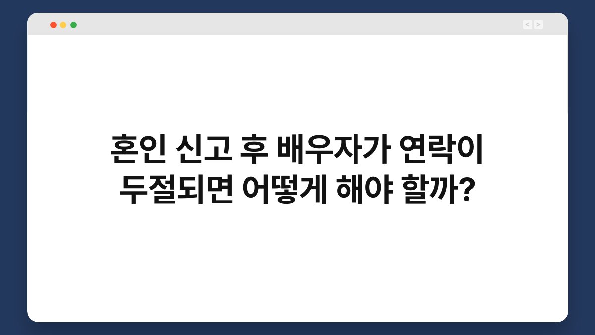 혼인 신고 후, 사랑하는 배우자와의 연락이 두절되는 상황은 누구에게나 충격적일 수 있습니다. 이런 일이 발생하면 마음이 복잡해지고 불안해지기 마련이죠. 하지만 걱정하지 마세요. 이 글에서는 혼인 신고 후 배우자가 연락이 두절되었을 때 취할 수 있는 방법과 대처 방안을 안내해 드리겠습니다. 이 과정을 통해 혼란스러운 마음을 조금이나마 덜 수 있을 것입니다.