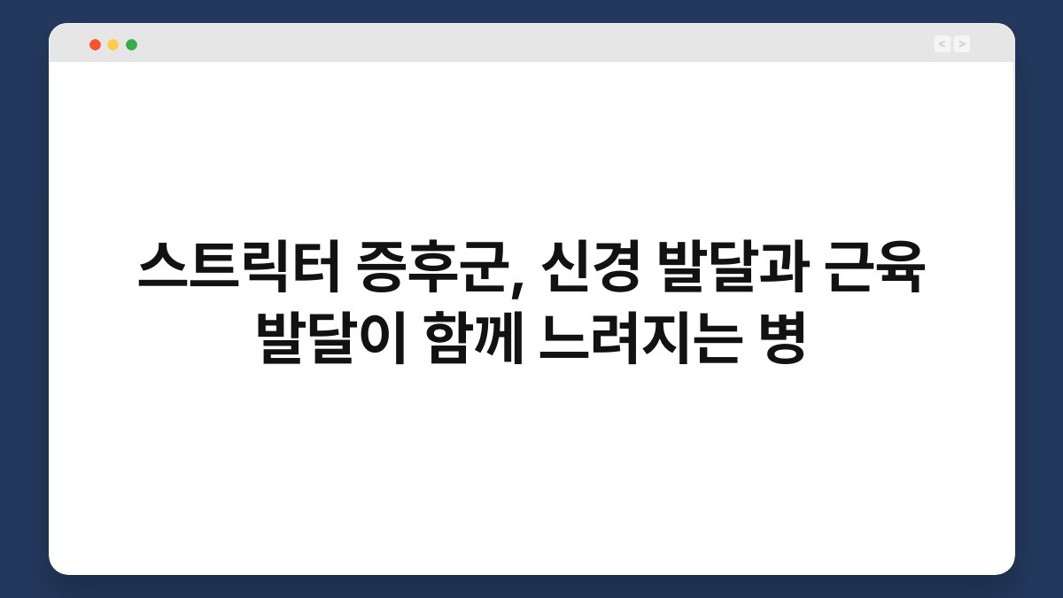 스트릭터 증후군, 잘 들어보셨나요? 이 병은 신경 발달과 근육 발달이 함께 느려지는 특성을 가지고 있습니다. 많은 부모님들이 자녀의 발달이 느리다고 느낄 때, 그 원인을 찾기 위해 고민하곤 하죠. 스트릭터 증후군은 그 중 하나로, 조기 발견과 적절한 치료가 중요합니다. 오늘은 이 증후군에 대해 자세히 알아보도록 하겠습니다. 스트릭터 증후군이란 무엇인가요? 증후군의 정의 스트릭터 증후군은 신경 발달과 근육 … 더 읽기