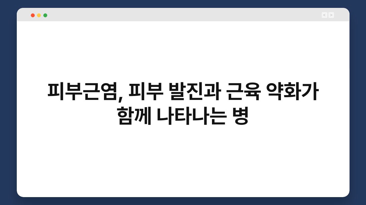 피부 근염, 피부 발진과 근육 약화가 함께 나타나는 병에 대해 들어보셨나요? 이 질환은 피부와 근육에 동시에 영향을 미치며, 일상생활에 큰 불편을 초래할 수 있습니다. 피부 발진과 근육 약화는 서로 다른 증상처럼 보이지만, 사실 이 두 가지가 함께 나타나는 경우가 많습니다. 이 글에서는 피부 근염의 원인, 증상, 진단 및 치료 방법에 대해 자세히 알아보겠습니다. 마지막까지 함께 … 더 읽기
