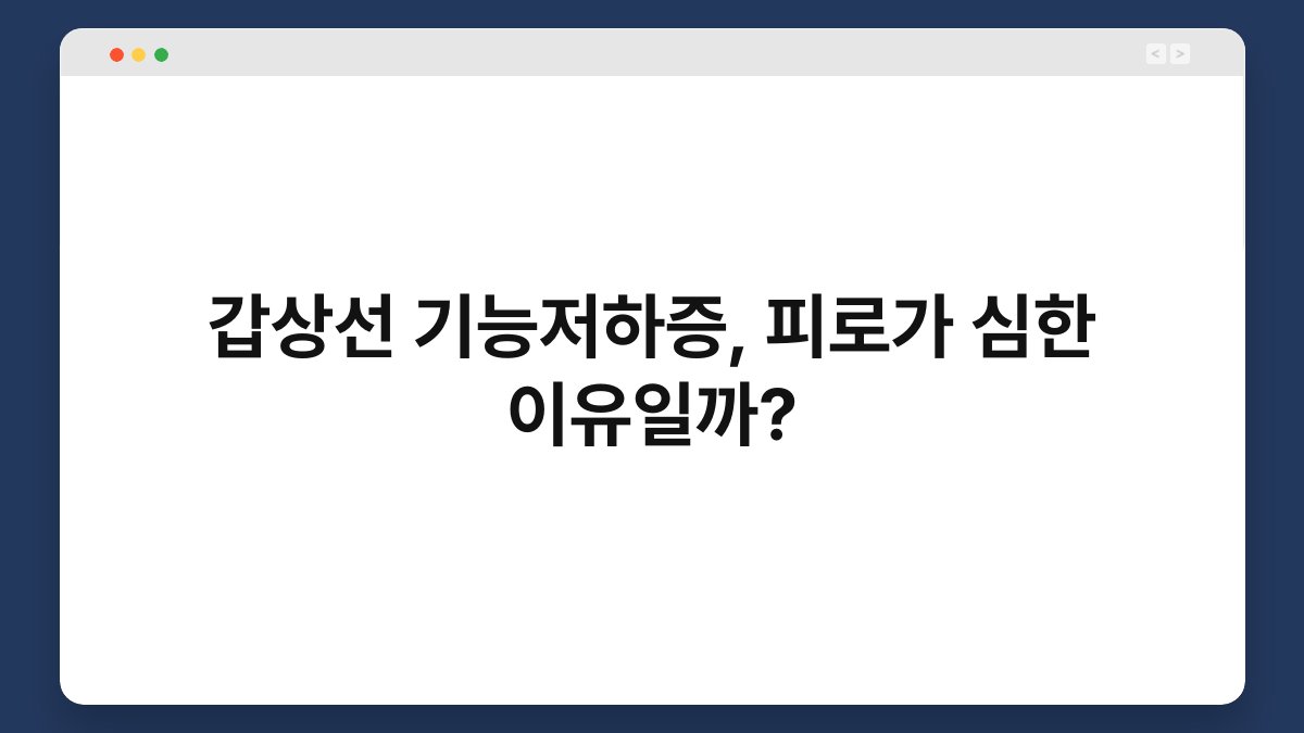 피로가 심한 날, 혹시 갑상선 기능저하증을 의심해본 적 있으신가요? 많은 사람들이 느끼는 만성적인 피로는 단순한 스트레스나 수면 부족으로 치부되기 쉽습니다. 하지만 이 피로가 갑상선 문제와 관련이 있다면, 상황은 다르게 전개될 수 있습니다. 갑상선 기능저하증은 우리 몸의 에너지를 조절하는 중요한 역할을 하는 갑상선 호르몬의 결핍으로 발생합니다. 이 글에서는 갑상선 기능저하증이 피로에 미치는 영향과 그 증상, 관리 … 더 읽기