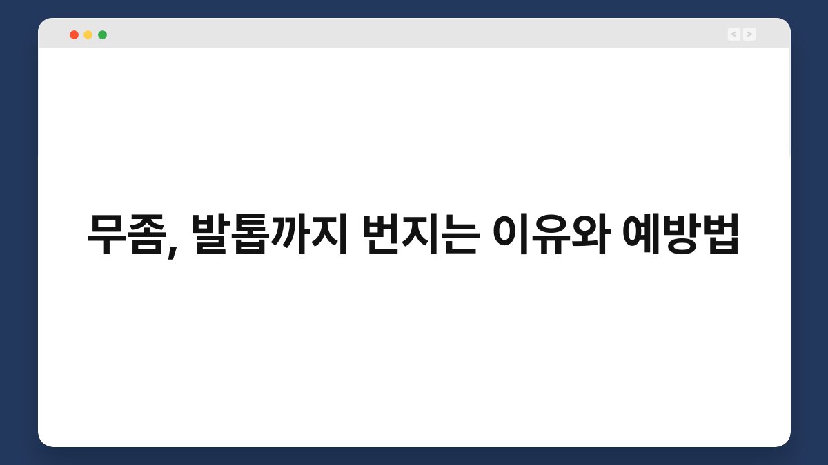 무좀, 발톱까지 번지는 이유와 예방법은 많은 분들이 궁금해하는 주제입니다. 발에 생기는 무좀은 단순한 피부 문제로 여겨지기 쉽지만, 방치하면 발톱까지 번질 수 있습니다. 무좀의 원인과 예방법을 알아보면, 건강한 발을 유지하는 데 큰 도움이 될 거예요. 이 글을 통해 무좀의 기초부터 예방 방법까지 자세히 알아보겠습니다. 무좀의 정의와 원인 무좀이란 무엇인가요? 무좀은 피부에 곰팡이가 감염되어 발생하는 질환으로, 주로 … 더 읽기