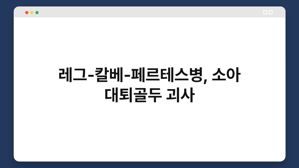 어린이의 건강은 부모에게 가장 큰 걱정거리입니다. 특히 소아 대퇴골두 괴사와 관련된 레그-칼베-페르테스병은 부모에게 큰 불안 요소로 작용할 수 있습니다. 이 병은 대퇴골두의 혈액 공급이 차단되어 발생하는 질환으로, 조기 발견과 적절한 치료가 중요합니다. 오늘은 이 병의 증상, 원인, 진단 및 치료 방법에 대해 알아보겠습니다. 자녀의 건강을 지키기 위한 유용한 정보를 제공할 테니 끝까지 함께해 주세요. 레그-칼베-페르테스병의 … 더 읽기