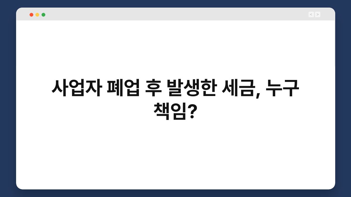 사업을 하다가 폐업하게 되면 여러 가지 걱정이 따릅니다. 특히, 폐업 후에도 세금 문제가 남아있다면 더욱 불안할 수밖에 없죠. 과연 이러한 세금은 누구의 책임일까요? 이 글에서는 사업자 폐업 후 발생한 세금 문제를 정리하고, 책임 소재를 명확히 해드리겠습니다. 세금 문제에 대한 이해를 돕기 위해 다양한 사례를 살펴보며, 여러분의 궁금증을 해소해드릴게요. 사업자 폐업 후 세금 발생 이유 세금 … 더 읽기
