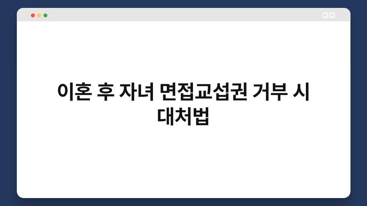 이혼 후 자녀 면접교섭권을 거부당하는 상황, 많은 부모님들이 겪는 어려움 중 하나입니다. 자녀와의 소중한 시간을 잃는 것은 정말 힘든 일인데요. 그렇다면 이런 상황에서 어떻게 대처해야 할까요? 이 글에서는 자녀 면접교섭권 거부 시 대처법을 알려드리겠습니다. 함께 알아보며 실질적인 해결책을 찾아보세요. 자녀 면접교섭권의 개념 이해하기 자녀 면접교섭권이란 이혼 후 부모가 자녀와 정기적으로 만날 수 있는 권리를 말합니다. … 더 읽기