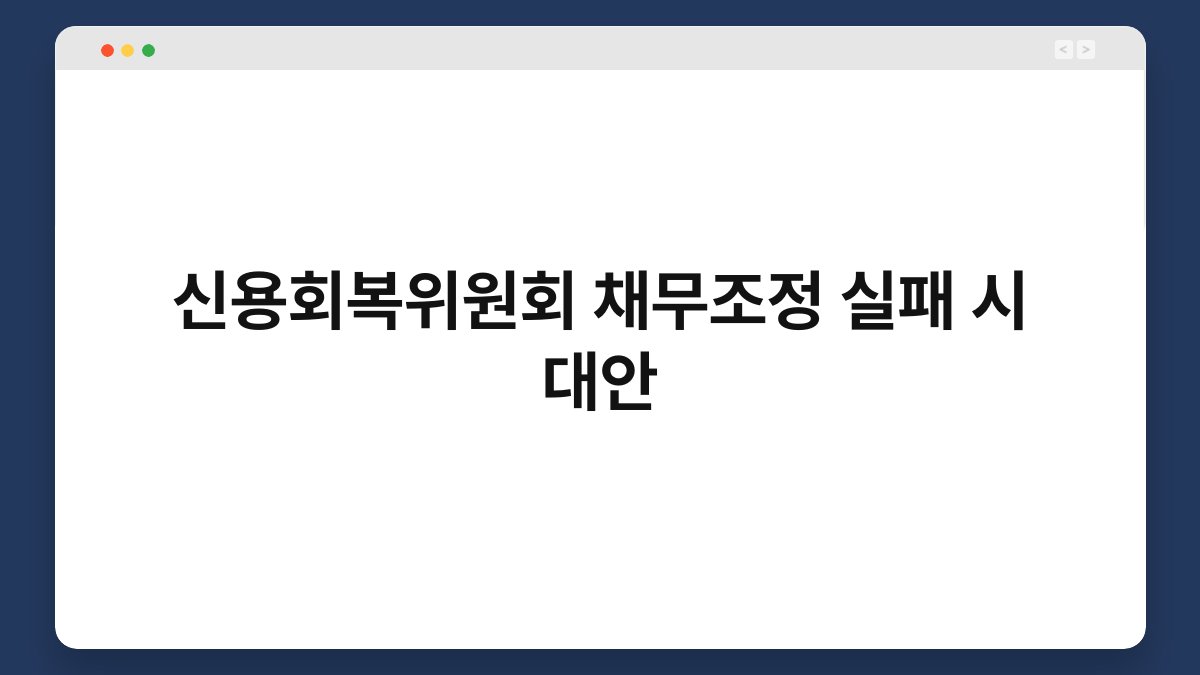 재정적인 어려움, 누구에게나 찾아올 수 있는 문제입니다. 특히 채무가 쌓여가는 상황에서는 더욱 힘든 마음을 느끼게 됩니다. 신용회복위원회에 채무조정을 신청했지만, 원하는 결과를 얻지 못했다면 걱정이 클 것입니다. 그러나 실망할 필요는 없습니다. 다양한 대안이 존재하므로, 이 글을 통해 실패 이후의 대처 방법을 알아보세요. 대출 재조정의 가능성 대출 재조정이란? 대출 재조정은 기존 대출 조건을 변경하여 상환 부담을 줄이는 … 더 읽기