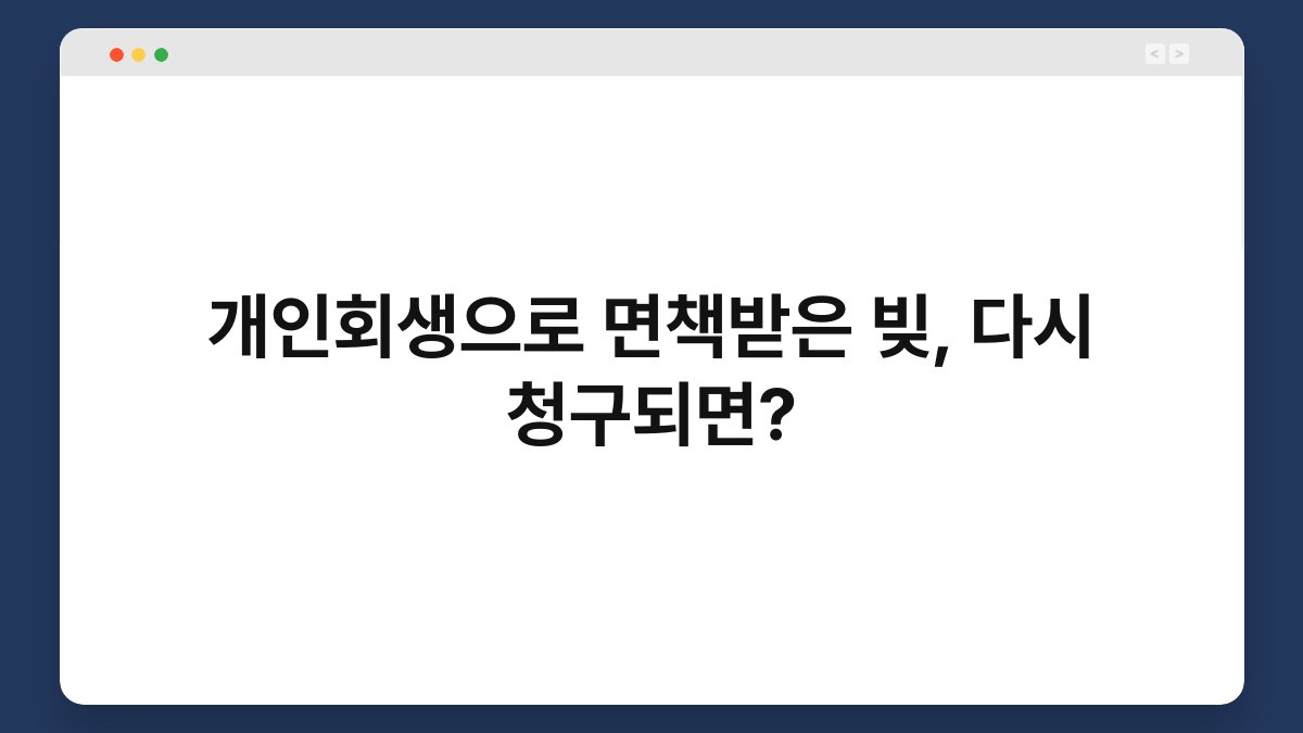 부채 문제로 고민하고 계신가요? 개인회생으로 면책받은 빚이 다시 청구될 수 있다는 사실은 많은 이들에게 충격적일 수 있습니다. 이 글에서는 개인회생 절차와 면책의 의미, 그리고 만약 빚이 다시 청구된다면 어떻게 대응해야 하는지를 알아보겠습니다. 끝까지 읽어보시면, 상황을 현명하게 대처하는 데 도움이 될 정보가 가득합니다. 개인회생의 개념 이해하기 개인회생이란 무엇인가요? 개인회생은 경제적으로 어려운 상황에 처한 개인이 법원의 도움을 … 더 읽기