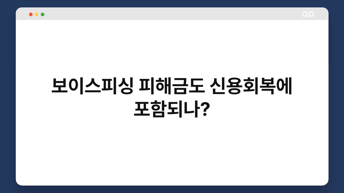 보이스피싱 피해, 생각보다 많은 분들이 경험하고 계실 텐데요. 이러한 피해를 입고 나면 경제적 손실은 물론 정신적 고통도 따르기 마련입니다. 그래서 많은 분들이 궁금해하시는 부분이 있습니다. 보이스피싱으로 인한 피해금이 신용회복에 포함될 수 있는지에 대한 질문이죠. 이 글에서는 보이스피싱 피해금이 신용회복에 어떤 영향을 미치는지, 그리고 이를 대처하는 방법에 대해 알아보겠습니다. 함께 살펴보시죠! 보이스피싱 피해금의 신용회복 포함 여부 … 더 읽기