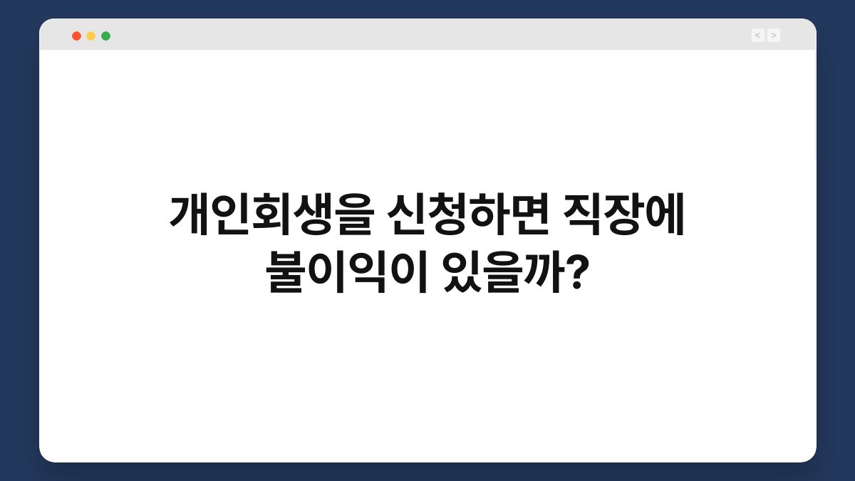 개인회생을 신청하는 과정은 많은 이들에게 새로운 출발을 의미합니다. 하지만 이 과정에서 직장에 미칠 수 있는 영향은 걱정스러운 부분일 수 있습니다. 많은 사람들이 개인회생을 신청하면 직장에서 불이익을 받을까 고민하곤 하죠. 오늘은 개인회생 신청이 직장에 미치는 영향에 대해 자세히 알아보겠습니다. 이 글을 통해 불안감을 해소하고, 올바른 결정을 내리는데 도움이 되길 바랍니다. 개인회생의 개념 이해하기 개인회생이란? 개인회생은 경제적으로 … 더 읽기