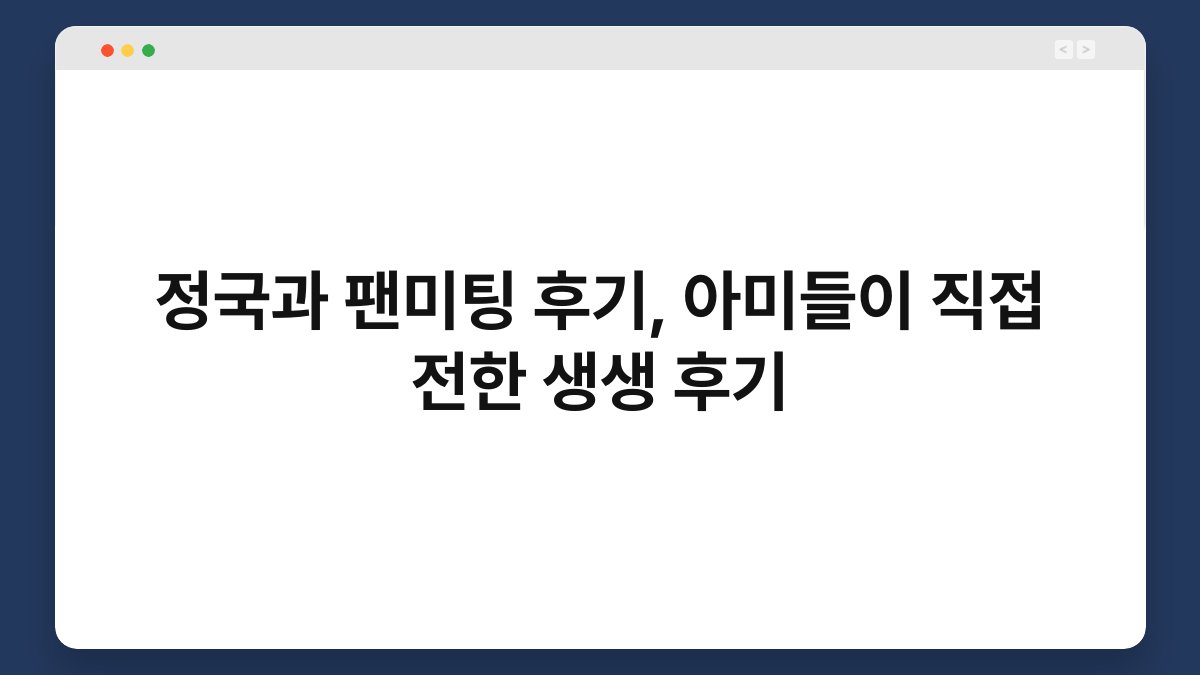 정국과의 팬미팅, 그 생생한 순간이 궁금하신가요? 아미들이 전한 후기는 그 어떤 후기보다도 진솔하고 감동적입니다. 이번 글에서는 팬미팅에서의 특별한 순간과 아미들이 직접 전한 생생한 후기를 통해 그 현장의 열기를 느껴보도록 하겠습니다. 팬미팅의 다양한 매력과 아미들의 소중한 이야기를 함께 나누며, 여러분도 함께 그 감동을 경험해 보세요. 정국의 팬미팅 현장 팬미팅 준비 과정 팬미팅이 열리기 전, 아미들은 설렘으로 … 더 읽기