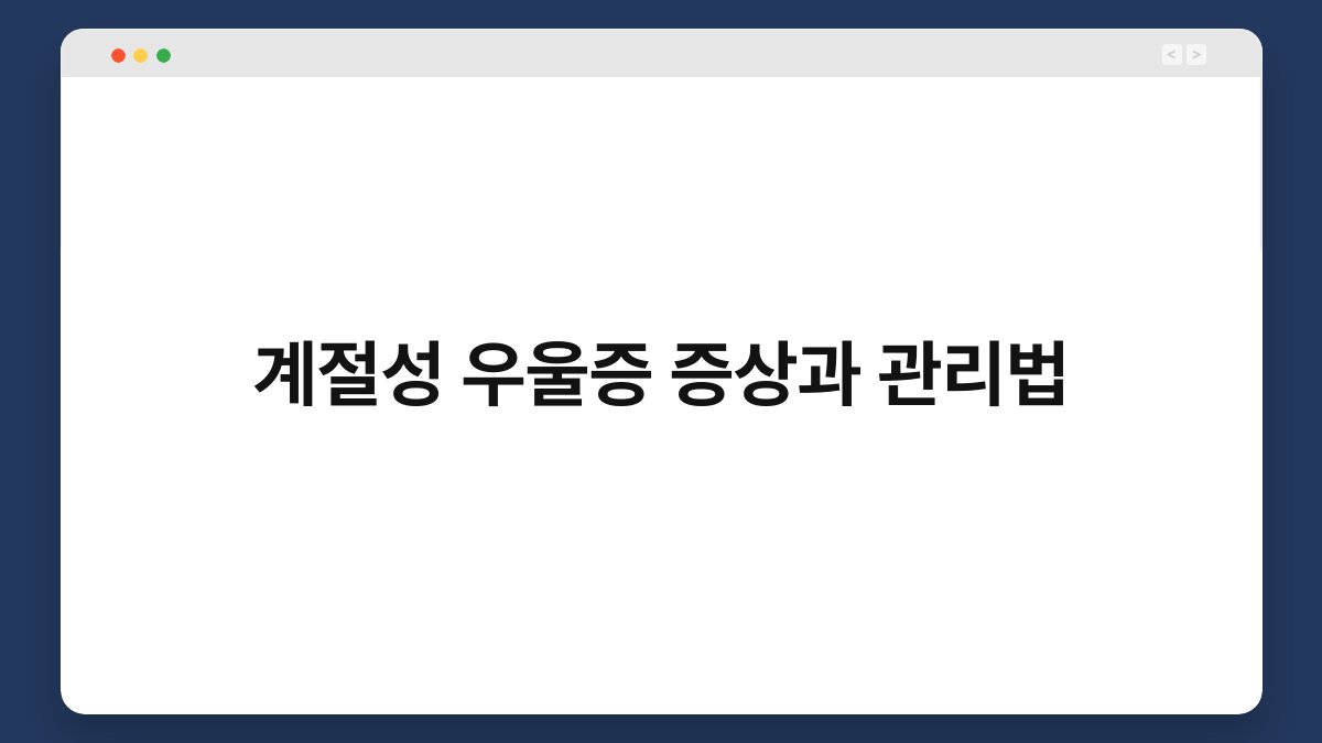 가을이 깊어지면서 우울한 기분이 드는 분들이 많으실 거예요. 특히 계절이 바뀌면 기분이 저하되는 경우가 잦은데, 이를 계절성 우울증이라고 합니다. 이 글에서는 계절성 우울증의 증상과 효과적인 관리법에 대해 알아보겠습니다. 여러분의 마음을 가볍게 해줄 팁을 소개할 테니 끝까지 함께해 주세요. 계절성 우울증이란? 계절성 우울증은 주로 가을과 겨울에 발생하는 우울증의 일종입니다. 이 시기에 햇빛이 줄어들면서 기분이 우울해지는 현상이 … 더 읽기