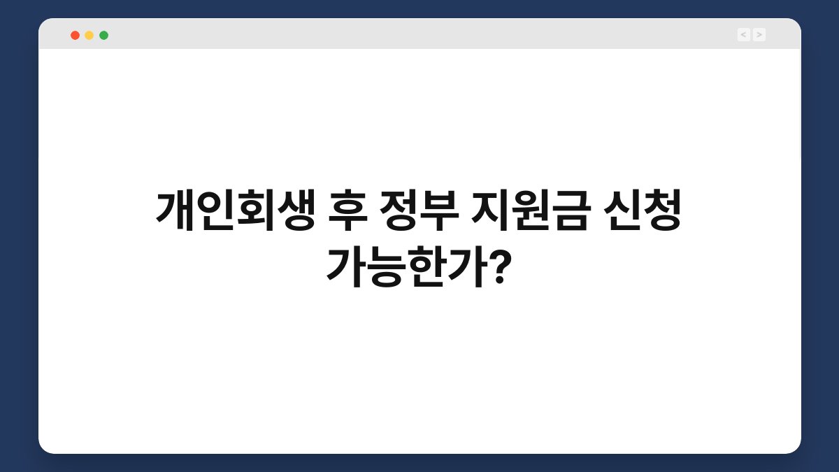 개인회생, 많은 분들이 어려운 경제 상황에서 새로운 시작을 위한 선택으로 고려하고 계시죠? 하지만 개인회생 후 정부 지원금 신청이 가능한지 궁금하신 분들도 많을 겁니다. 이 글에서는 개인회생 절차와 정부 지원금의 관계를 살펴보며, 지원금 신청 방법과 조건에 대해 알아보겠습니다. 끝까지 읽으시면 유익한 정보가 가득하니 기대해 주세요! 개인회생의 개념과 절차 개인회생이란 무엇인가요? 개인회생은 경제적 어려움을 겪는 개인이 채무를 … 더 읽기