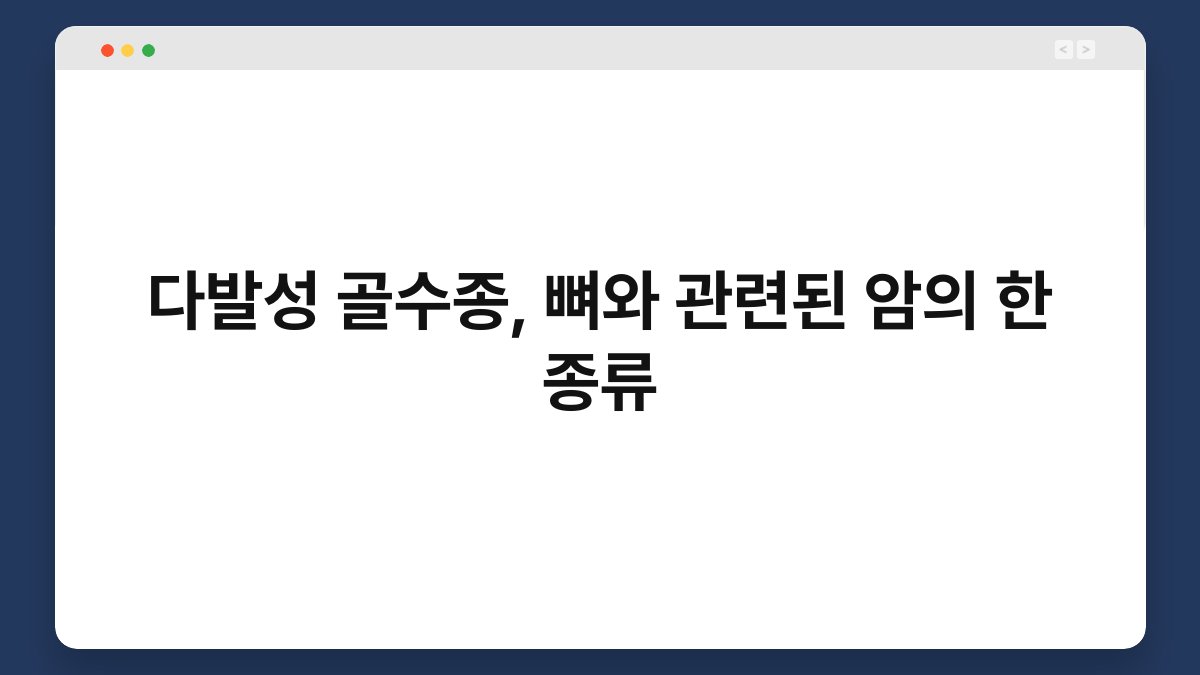 우리 몸에서 가장 중요한 역할을 하는 뼈, 그 뼈에 관련된 암, 다발성 골수종에 대해 이야기해볼까요? 다발성 골수종은 뼈와 관련된 암의 한 종류로, 많은 사람들에게 생소할 수 있습니다. 하지만 이 질병은 우리 몸의 면역체계에 심각한 영향을 미칠 수 있죠. 오늘은 다발성 골수종의 증상, 진단, 치료 방법에 대해 알아보겠습니다. 이 정보를 통해 여러분의 건강을 지키는 데 도움이 … 더 읽기
