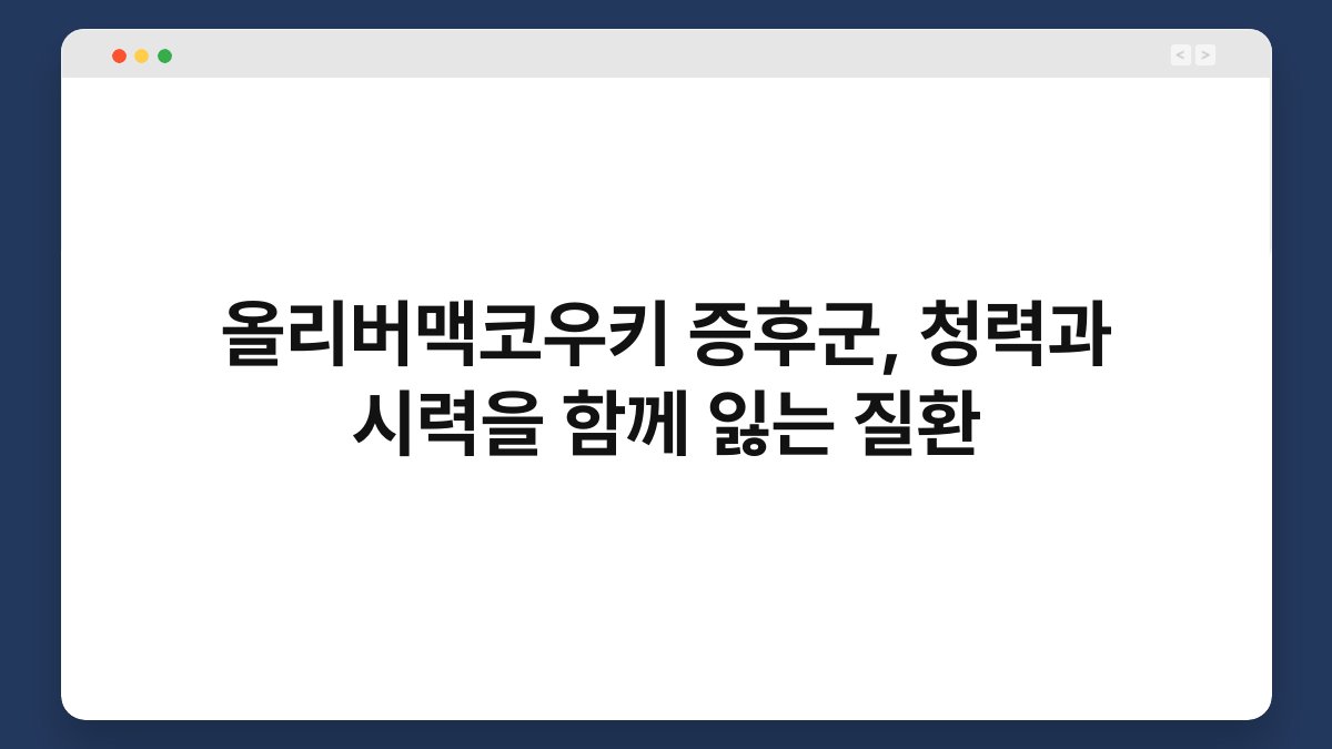 청력과 시력을 동시에 잃는 올리버맥코우키 증후군, 들어보셨나요? 이 질환은 많은 사람들에게 생소하지만, 그로 인해 삶의 질이 크게 저하될 수 있습니다. 오늘은 이 증후군의 원인과 증상, 그리고 예방 방법에 대해 알아보겠습니다. 정보를 통해 이해를 높이고, 필요한 경우 적절한 대응을 할 수 있도록 도와드릴게요. 함께 이 주제를 살펴보도록 하겠습니다. 올리버맥코우키 증후군의 정의 이 증후군은 무엇인가요? 올리버맥코우키 증후군은 … 더 읽기